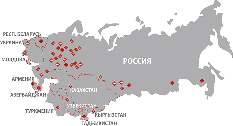 Наша продукция представлена более, чем в 50 регионах Российской Федерации, а также в странах ближнего зарубежья: Казахстан, Таджикистан, Узбекистан, Беларусь, Армения, Украина, Молдова.
