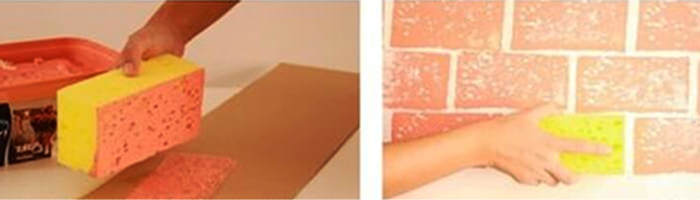 Обмакнутая губка в краску превращается в отличную печать камня для стены. Методом стемпинга напечатайте кирпичный узор. О чудо, теперь пора принимать восторженных гостей, которые непременно начнут трогать ваше творение руками.