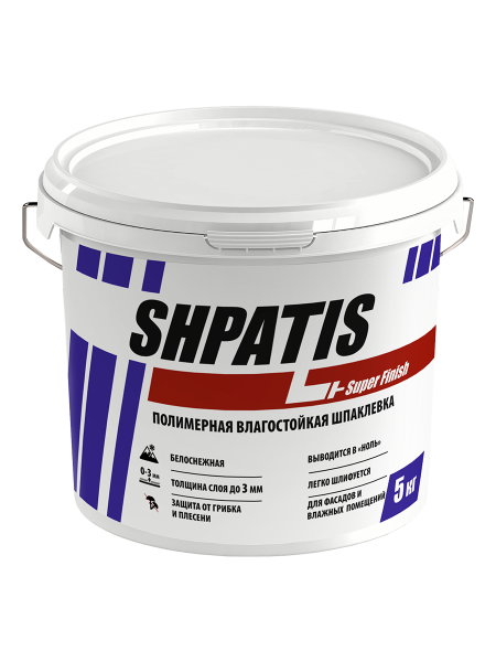Влагостойкая шпаклевка SHPATIS идеальна для подготовки стен внутри помещений с высокой влажностью под покраску и другие выды декоративной отделки. Может применяться для шпаклевания фасадов. Подходит для нанесения на бетонные, оштукатуренные, гипсокартонные, ДВП, ЦСП, пазогребневые плиты и другие виды поверхностей. Обладает высокой силой сцепления с поверхностью.