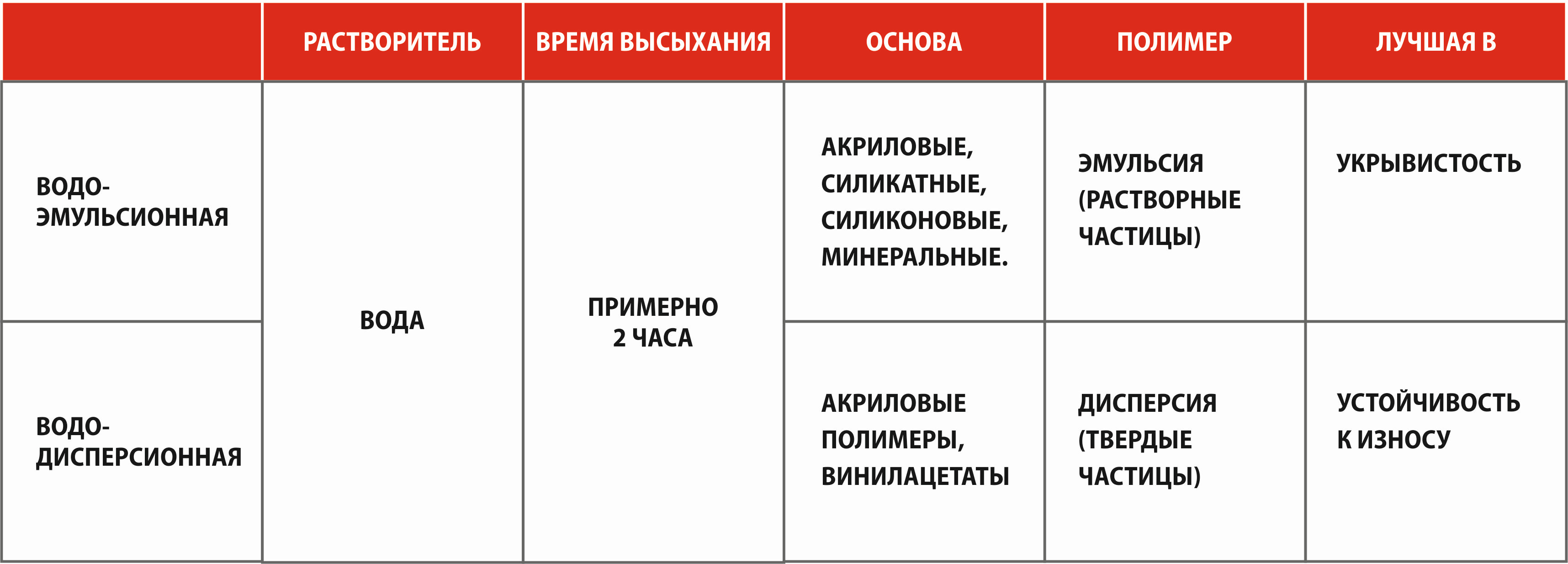 В водоэмульсионных красках акриловый полимер присутствует в виде эмульсии, в водо-дисперсионной – в виде дисперсии.